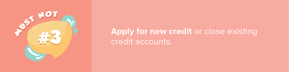 Refrain from applying for new credit, even if it's a new credit card. When you have your credit run by several different financial channels, including mortgage, auto, or credit cards, your credit score will be affected. Lower credit scores can impact the interest rate for which you were originally approved, and could even affect your eligibility for approval.